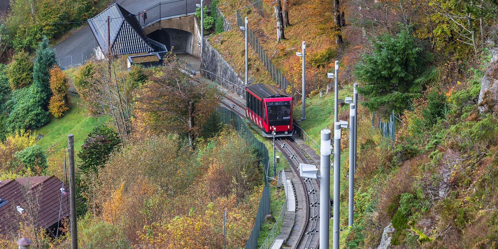 Nehmen Sie die Fløibanen-Standseilbahn zum Gipfel des Fløyen! Genießen Sie den spektakulären Blick auf die Stadt, den Spielplatz für Kinder und das…