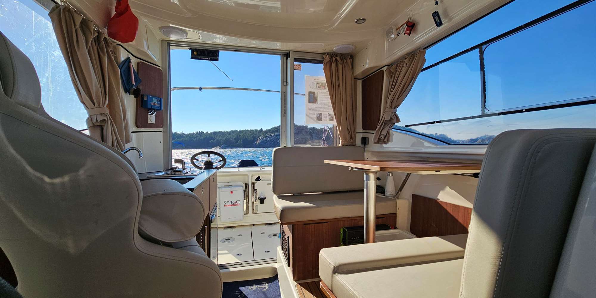 Innen- und Außensteuerkonsole, Simrad 9” NNS evo 3 Kartenplotter im Innenraum der Kabine & Simrad 7” NNS evo 3 Kartenplotter außen am Heck, Echolot, 3G Radar, Simrad RS40 VHF mit AIS, zwei 115Ah Batterien & separate 115Ah Motorstartbatterie, 175W Solarpanel auf dem Dach, fest installierter 1000W 220V Sinus-Wechselrichter, Scheinwerfer/Suchscheinwerfer auf dem Dach, Dieselheizung mit Lüftung für die Kabine, Fusion RA-70 Audiosystem, 580L Kraftstofftank, Heckanker-Winde mit Fernbedienung, Trimmklappen mit Steuerung auf den Steuerkonsolen innen & außen, Bugstrahlruder mit Steuerung innen und außen, automatischer Motortrim, kaltes & warmes Wasser.