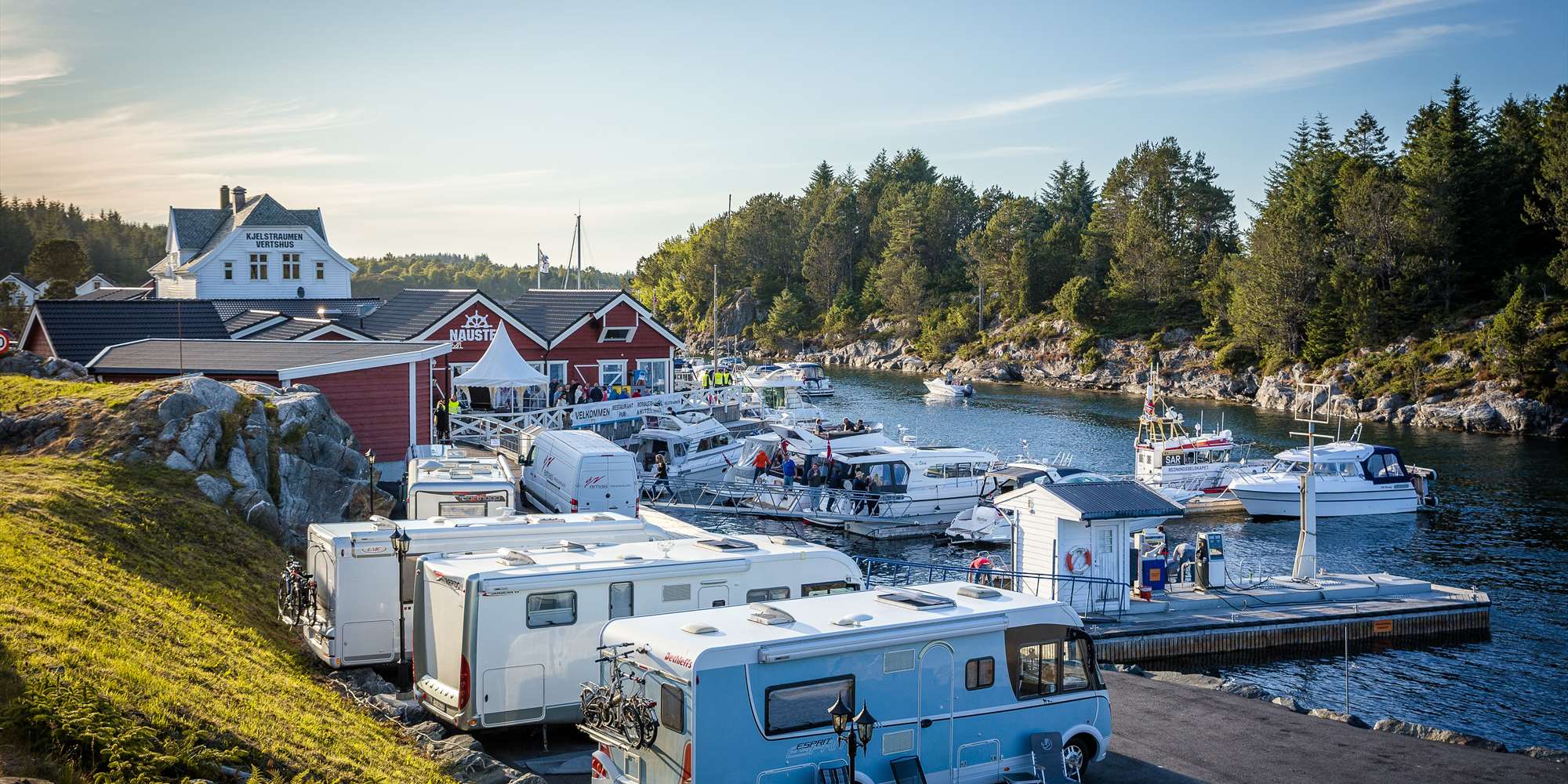 Folgen Sie der Straße Rv 57 ab Rutledal bis Sløvåg, von dort mit der Fähre hinüber nach Leirvåg. Folgen Sie dann der Straße Rv 57 Richtung Austrheim bis Kilstraumen.